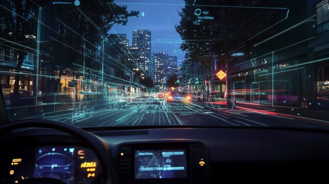 Night city street view from inside a car with augmented reality interface showing digital overlay of buildings and traffic.