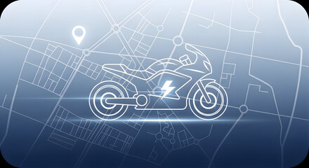 Digital interface showing a futuristic electric motorcycle with a GPS location pin on a city map, representing the concept of smart e-mobility and future transport