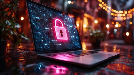 Modern laptop screen display featuring digital lock icon representing cybersecurity, secure data protection, and robust online defense