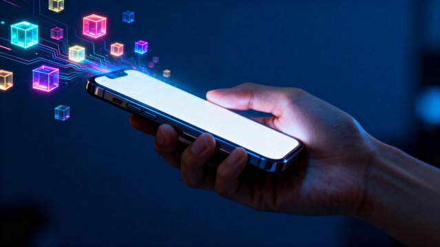 person holding a glowing mobile phone surrounded by floating tech cubes, creating a futuristic atmosphere of innovation, connectivity, and digital advancement.Generated by AI