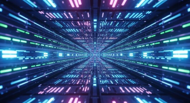 Symmetrical Digital Tunnel with Stacked Signal Layers and Bioluminescent Glow for Data Transmission Visual