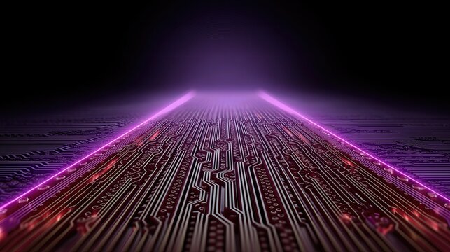 Glowing circuit board stretching into a purple neon horizon, a futuristic digital landscape evoking data flow, circuitry, and cyber aesthetics.