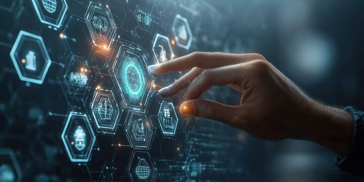 Close-up of a human hand interacting with glowing futuristic digital hexagonal interface with technology and data icons, conveying innovation and digital connection