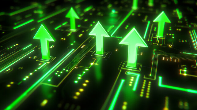 Futuristic green arrows pointing upward over a glowing electronic circuit board