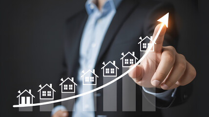 Man presenting virtual house with increasing growth rates