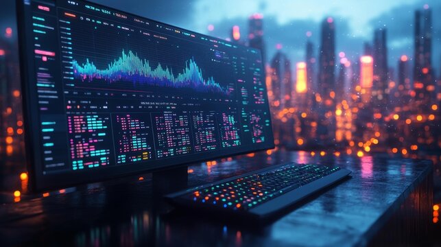 Futuristic Digital Cityscape with Stock Market Data Displayed on Screens and Reflections on Glass Surfaces, Evoking Innovation and Technology Trends in Business