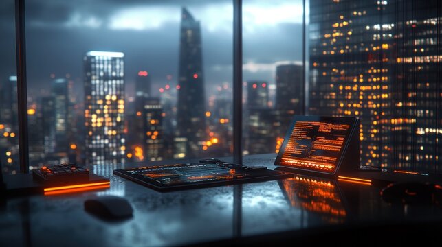 Futuristic Digital Interface With Urban Skyscraper Reflection Images