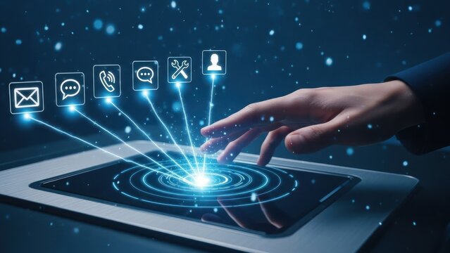Hand interacting with digital customer service icons on a dark surface.