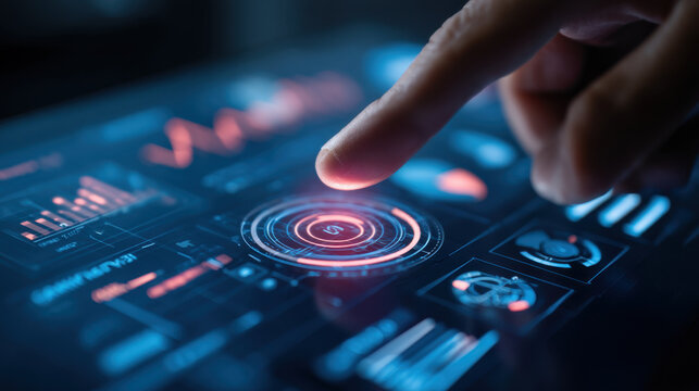 Person interacting with futuristic touchscreen interface displaying various data visualizations and graphs, showcasing technology and innovation. vibrant colors and intricate designs evoke sense