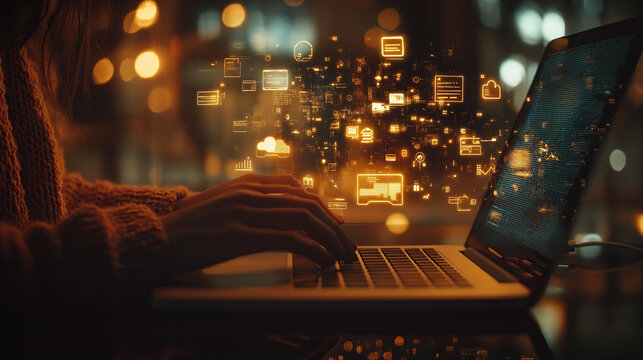 Person typing on a laptop with digital chat bubbles and icons overlayed
