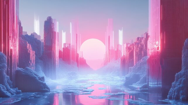 Futuristic Cityscape with Digital Elements and Reflective Surface