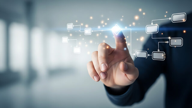 Business professional interacting with futuristic digital data interface using touch gestures in a dark environment showcasing advanced technology and analytics