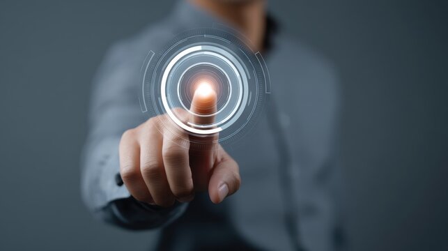 Businessman Touching Digital Interface with Futuristic Circular Elements for Technology and Innovation Concept in Modern Workplace Environment