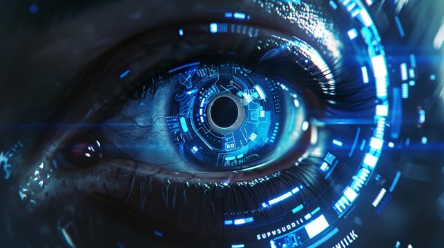 Digital cybernetic eye with glowing blue HUD and futuristic technology elements