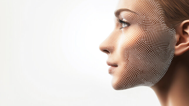 Profile view of a woman's face with digital facial recognition grid overlay, symbolizing biometrics and advanced technology.