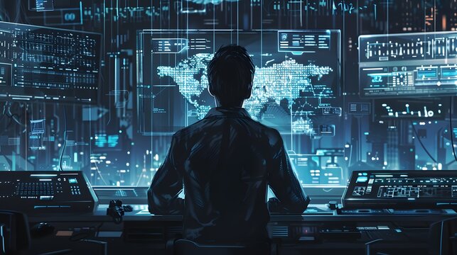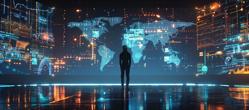 A silhouetted figure stands before a digital world map and data displays, suggesting analysis.