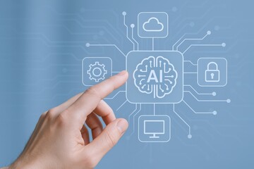 Artificial intelligence concept showcasing a brain design with hand touching the screen with technology icons