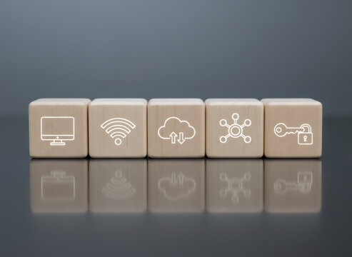 Wooden blocks with computer, wifi, cloud, network, and security key icons. Digital technology concept for data communication and internet security.