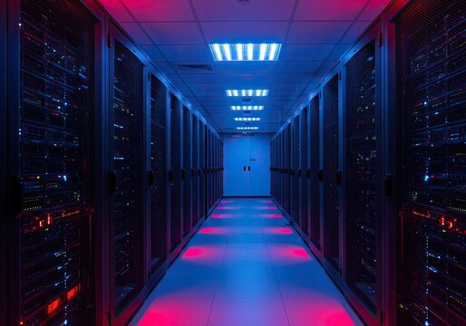 Modern data center server racks glow with blue and pink lights. Rows of computer servers create a high tech network infrastructure. This network hub supports big data and cloud computing.