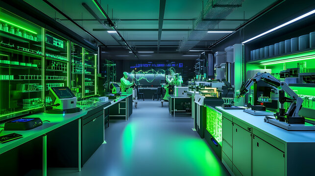 A futuristic lab with glowing green lights, robots working on 3D-printed components and walls lined with shelves of advanced tools and devices