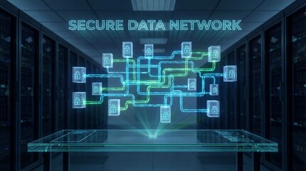 Secure data network digital database infrastructure server room glowing lines cybersecurity encrypted connection futuristic technology data protection information security network system modern