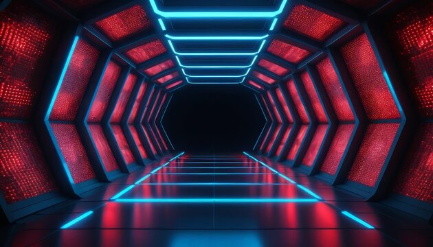 Futuristic digital tunnel with neon lights