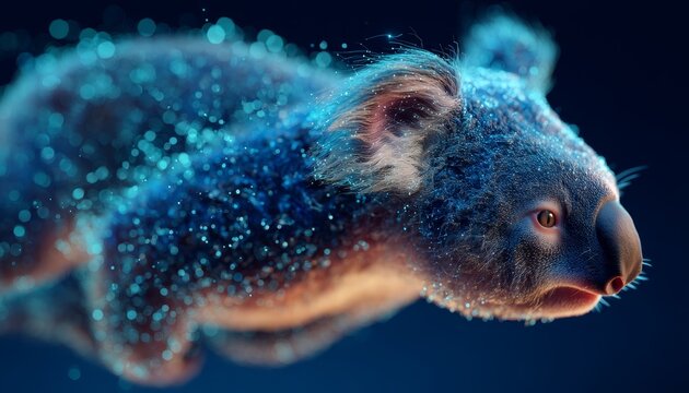 Futuristic Cybernetic Koala Floating Gracefully in a Vibrant Blue Digital Landscape Design