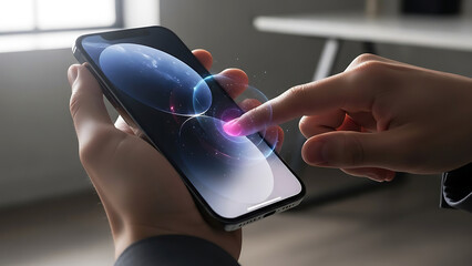 Finger touching a smartphone screen with a futuristic interface and digital glow effect