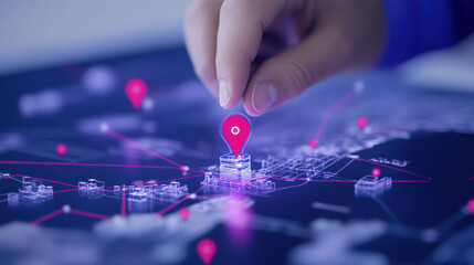 hand interacts with digital map interface, featuring glowing location markers and network lines, symbolizing advanced navigation technology