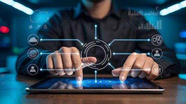 Person interacting with futuristic digital interface and data visualization for business analytics