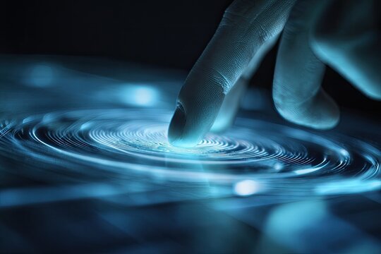 A finger touches a screen, radiating energy in concentric circles. Blue and black tones highlight the action