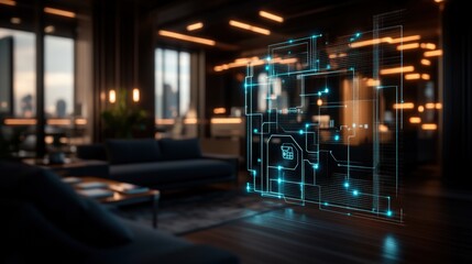 Modern smart home holographic interface with digital technology and virtual controls illustrating futuristic innovation and connected devices in a sleek living room setting