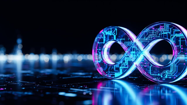 Glowing digital infinity symbol composed of intricate circuits rests on a dark reflective surface against a blurred futuristic city background symbolizing constant data flow.