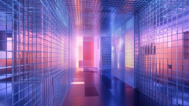 Abstract digital tunnel featuring a transparent wireframe grid structure, reflecting vibrant blue and glowing magenta orange light gradients, creating an immersive virtual pathway