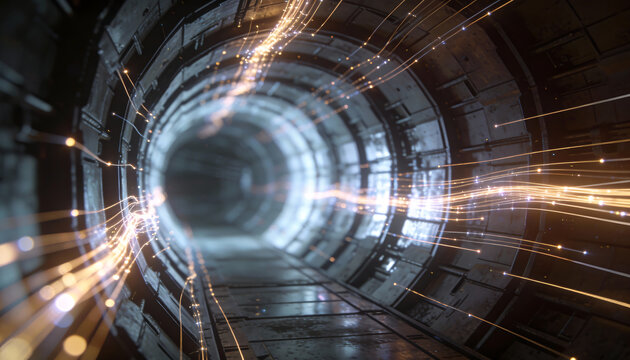 Abstract futuristic tunnel vortex with glowing particle light trails and motion blur technology data flow concept sci fi portal background with depth perspective