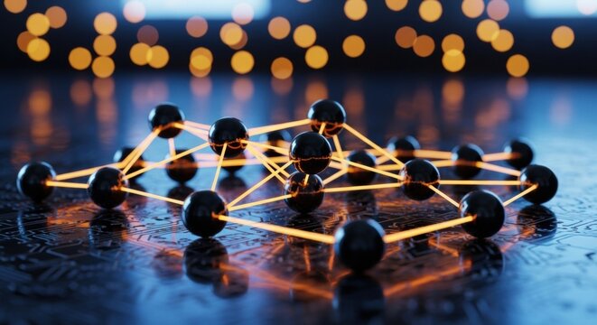 Futuristic digital network with glowing central node and orange bokeh