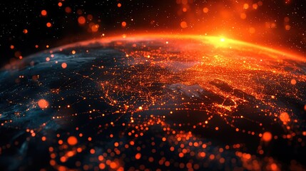 Planet earth showing illuminated urban areas and flowing data connections, representing a global communication network, technology, and energetic information exchange across continents