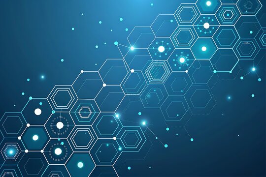 Abstract blue background featuring interconnected hexagonal network and glowing light particles
