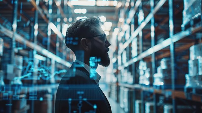 Warehouse, digital technology, man in industrial warehouse surrounded by shelves filled with goods visualized, representing modern logistics integration.using navigation system advanced e-commerce