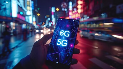 Futuristic concept  interactive holographic 6g text icon shining over mobile phone in hands.