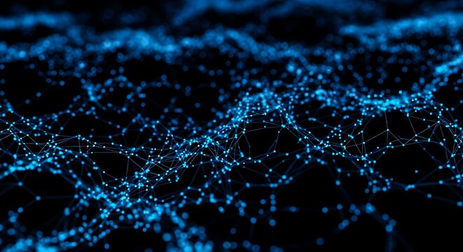 Abstract digital network visualization with glowing nodes and connecting lines, futuristic concept.