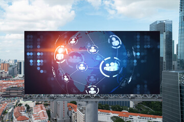 World planet Earth map hologram and social media icons on billboard over panorama city view of Singapore, Southeast Asia. The concept of people networking and connections.