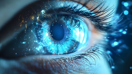 close up of human eye with digital, futuristic overlay, symbolizing technology and innovation. image captures intricate details of iris and surrounding digital elements, creating sense of