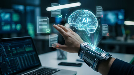 A male hand wearing a futuristic wrist device interacts with a holographic artificial intelligence brain and digital data documents in a modern office.