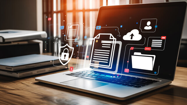 A digital illustration of a silver laptop with vibrant floating icons emerging from its illuminated keyboard
