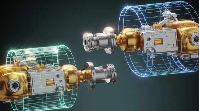Futuristic engine design with metallic gold and silver elements encased in glowing wireframe, showcasing innovation and advanced technology, perfect for engineering concepts