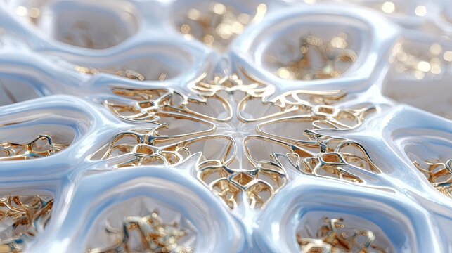 Golden and silver metallic lines intersect against a dark background, creating a futuristic and geometric network pattern, with glowing elements at connection points, resembling a digital grid