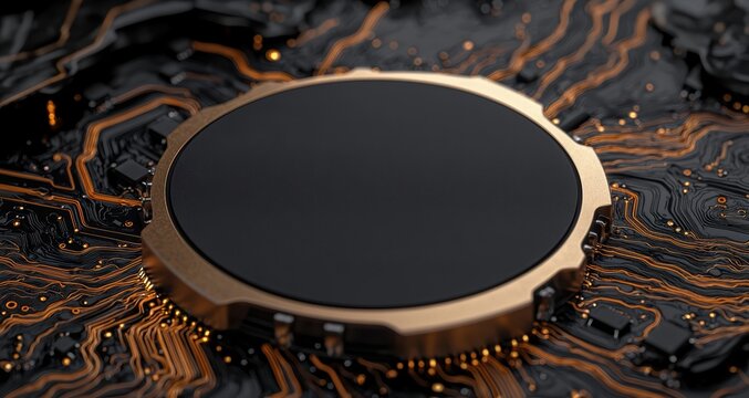 A close-up view of a futuristic circuit board, highlighting a central processing unit with glowing, swirling patterns.