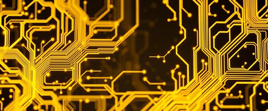 Abstract background of glowing yellow circuitry, intricate tech design, texture, modern