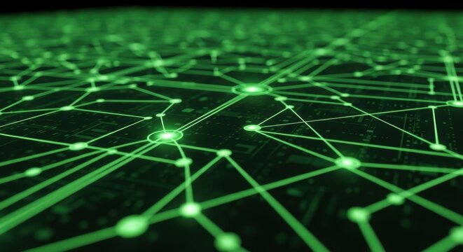 Digital network with green nodes and lines on dark background